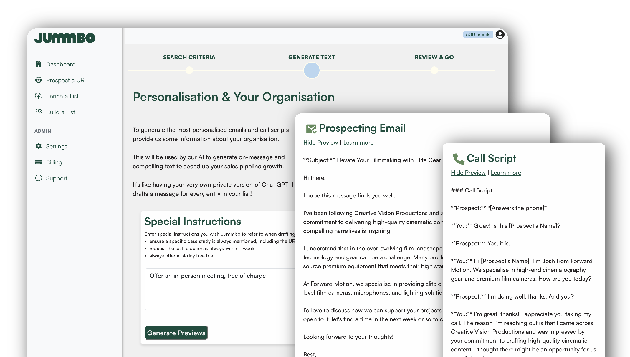 Jummbo will then gather their websites, social media profiles, and generate highly targeted cold emails, call scripts, and background information—ensuring you have everything you need to connect effectively.